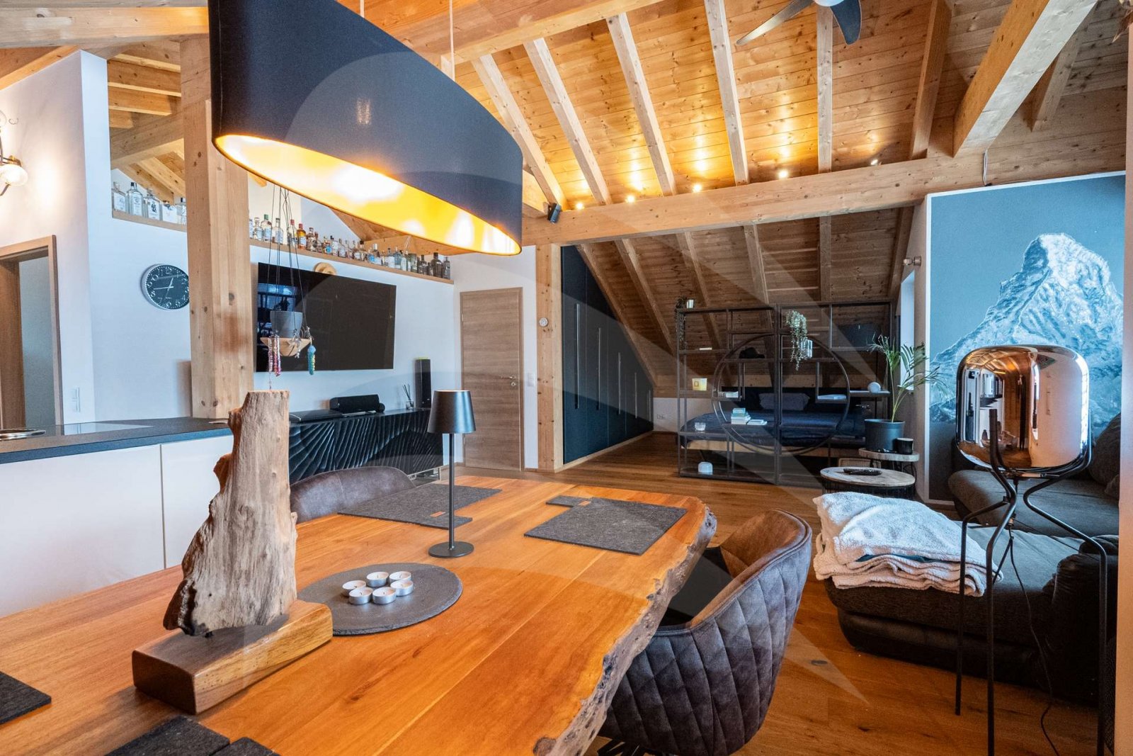 Das Highlight der Wohnung ist die offene Gestaltung des gesamten Wohnbereiches. In Verbindung mit dem Sicht-Dachstuhl entsteht hier eine Wohlfühl-Atmosphäre, die ihresgleichen sucht. Unterstrichen wird diese durch ein hochwertiges Eichenparkett, selbstverständlich mit Fußbodenheizung. Mit einem Einbauschrank wird die Dachschräge optimal genutzt.